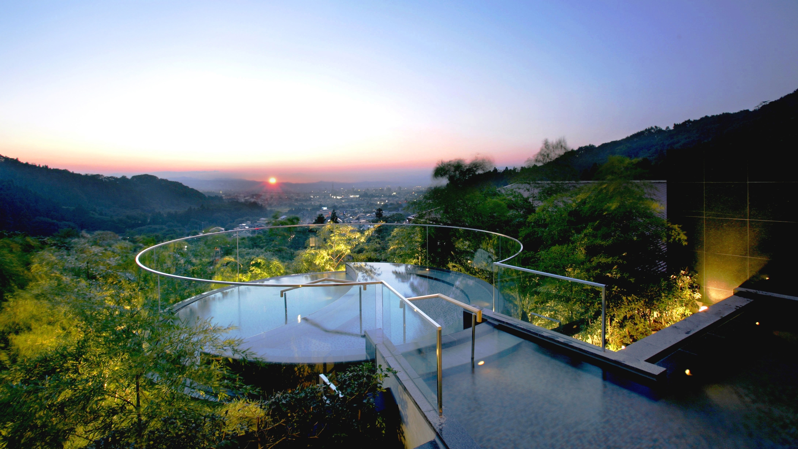 - 能舞台や竹林、滝などがライトアップされて夜もゴージャス
